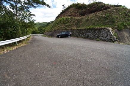 | 1 猪山展望台の駐車場です。約 5台駐車できます。 車の向こうに見える小高い丘のてっぺんが展望台と なっています。 |