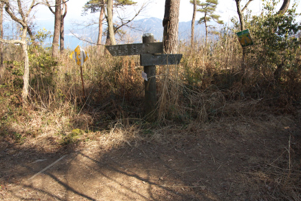 | 3 「大岩展望所」及び「展望台」へはこのような道が続きます。 | 4 しばらく進むと突き当たり、このような案内板が現れます 右へ行くとベンチのある展望台へ、左へ行くと大岩展望所へ。 |